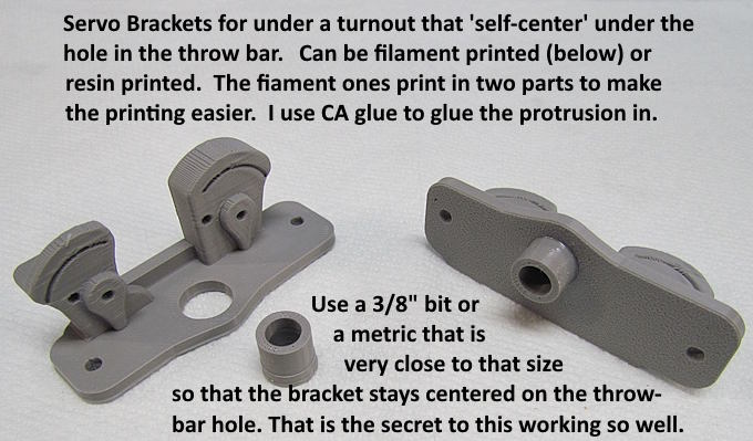This model of the servo bracket takes all of that one step further, you don't need any tools to easily/quickly mount the servo bracket with the servo on it under the layout in a minute or so. Also the piano control wire up to the turnout will be perfectly centered the first time.