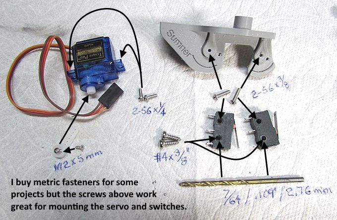 I realize some of you are metric oriented. If you can't find a metric size tap/screw to work consider buying the 2-56 tap and screws. They work perfect for the servo and the micro limit switch mounting. I use SAE fasteners for most my projects but also buy metric fasteners for some. They are both easy to find now via the internet regardless of where you live.