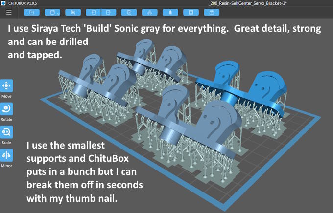 .... I place mine on the build plate as shown above. Notice that I'm using a resin that is strong and can be drilled and tapped. The resin also prints N scale rivets on other prints so I use it for everything. I also now use the smallest supports that are used by ChituBox and let it put in a bunch. I can pop them all off in seconds with my thumb nail after the print is cured and any filing/sanding of the support interface is easy and fast to do.