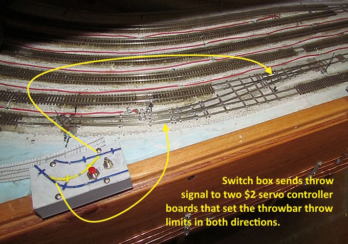 A single switch box can throw multiple servos at the same time. Above it is activating two $2 servo controller boards that can limit the throwbar throw in both directions. Later in the build a double cross-over will have 4 turnouts thrown with a single switch box like above.
