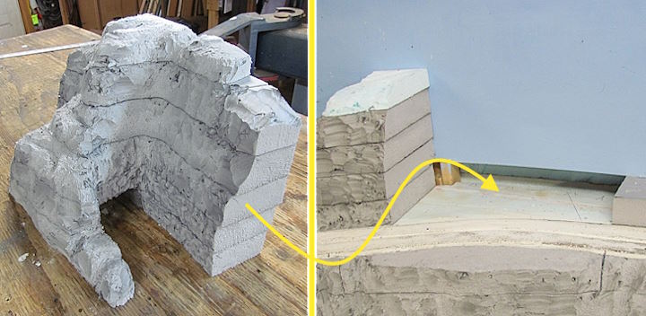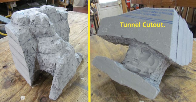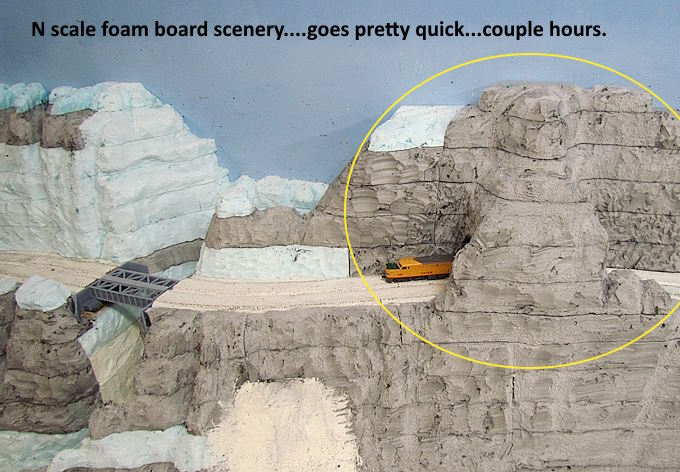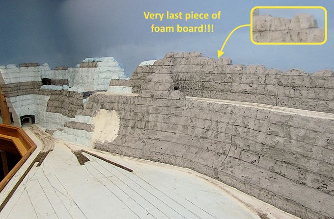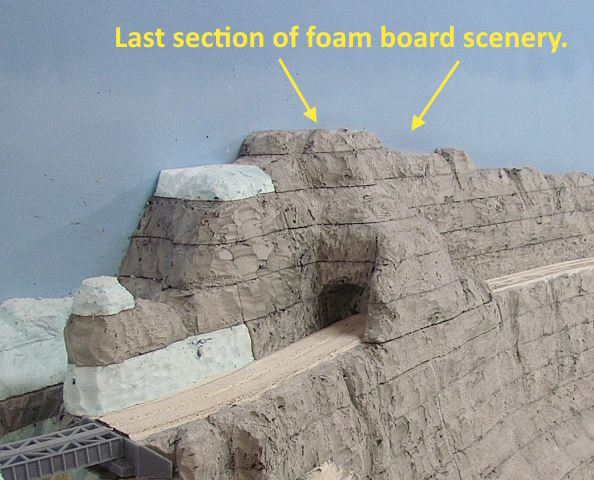 Approaching the end of roughing in the foam board scenery. Work stopped on the railroad at the end of the previous page for 6 days as we were out of town. One day back got the work in the first two images below done. Probably one more day needed after this to finish the sculpting the cap rock shown below and to fill in the gap on the upper level.