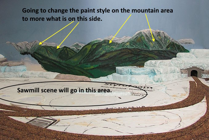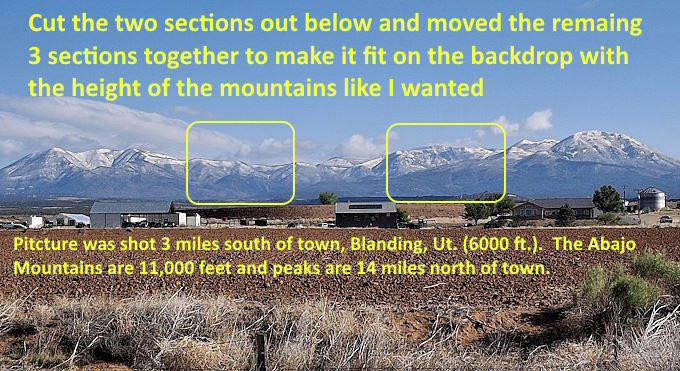 I want to use our mountains that are just north of town for the sawmill scene. I hope to end up with it looking like the base of the mountains start not far from the mill, closer that what the mountains look like above. To do that I wanted them to be fairly high on the back drop. I took the picture above about 3 miles south of our house, we are on the south end of town and the town is only 2 miles long (4000 people).