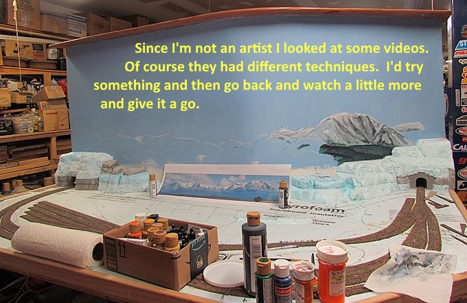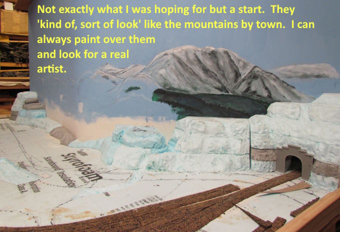 I’ll start with the hardest and get it out of the way and probably end up with someone else painting it. Actually I did paint some clouds on another back drop ( HERE ) but will probably redo those and the mountains by them.