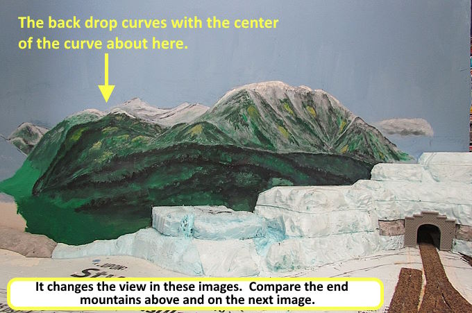 The backdrop has a fairly large curve to it and I noticed that if I take pictures of it the image looks different on the opposite sides of the curve. Look at the right and left mountains above and compare their shapes and how they appear above and ……