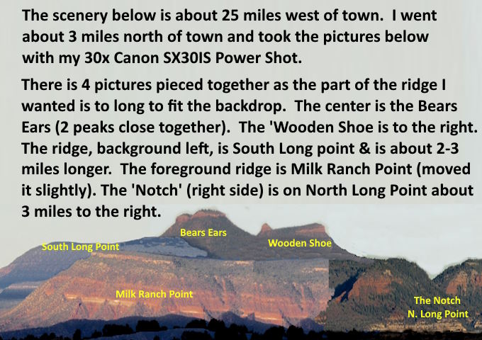 I can see the Bears Ears from the house but wanted to get pictures of them from a little further to the north so drove north a few miles by one of our reservoirs and took a series of photos of them and also the South and North Long Point ridges running to the south and north of them along with Milk Ranch Point (ridge) in front of them.