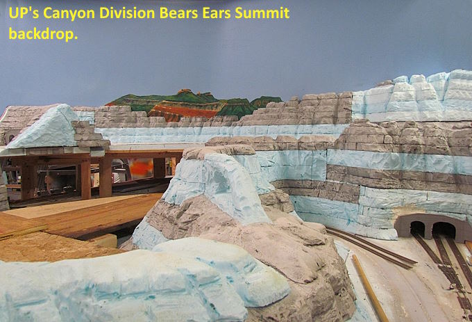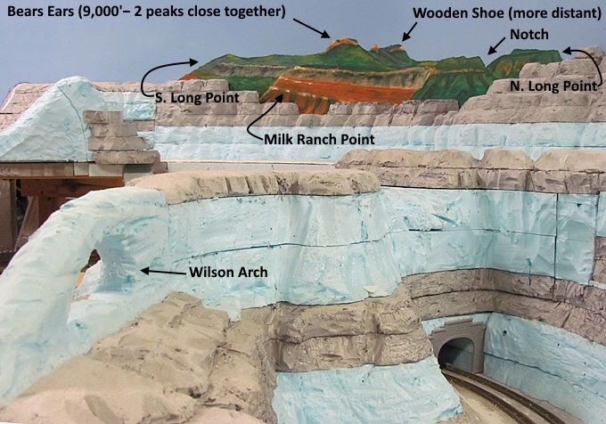 I’ve tried to model scenes that are in the surrounding area and this backdrop scene is another example of this. The Bears Ears are two small peaks about 25 miles west of us that we can see out the living room window. They are on the top of a high mesa and you can see them from over 80 miles away in Colorado, New Mexico and Arizona. There are over 1000 year old Anasazi ruins near them and spectacular views down 2500+ feet into canyons by them. The area there and in a large part of our county that is Forest Service and Bureau of Land Management and Wilderness was designated as the Bears Ears National Monument in 2016.