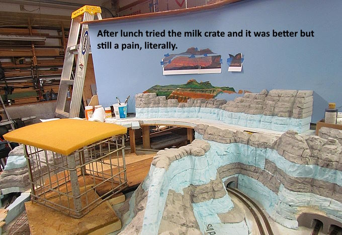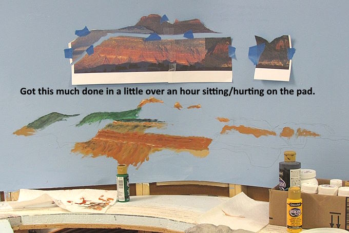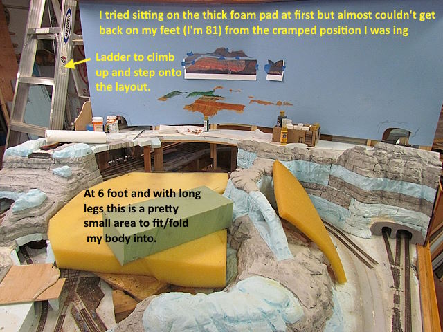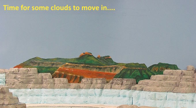 I’m glad that I made the scenery removable where my feet had to go. The scenery below and to the sides of the new backdrop scene is also removable.