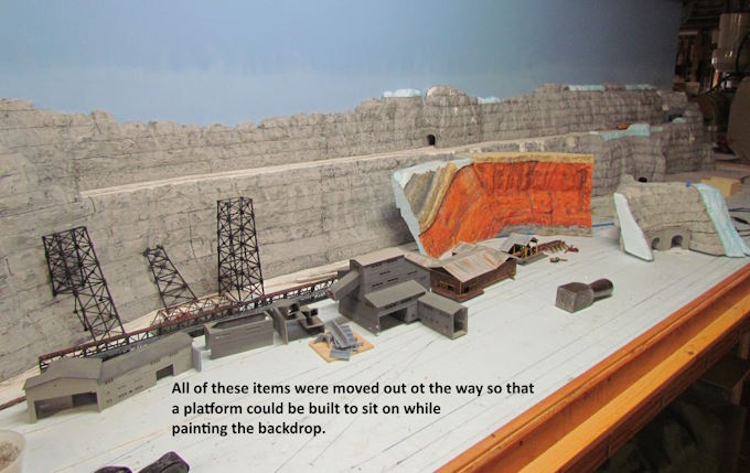 Next backdrop to be pained is on the opposite side of the backdrop from the sawmill scene. The upper level scene here is suppose to represent the mainline summit on the way to the sawmill.
