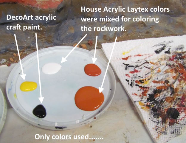 The colors above are the ones I used for the scene. Three of them are what I use to paint the rockwork and the other three came from the craft section at the local Ace Hardware.