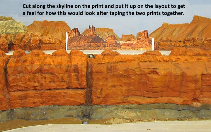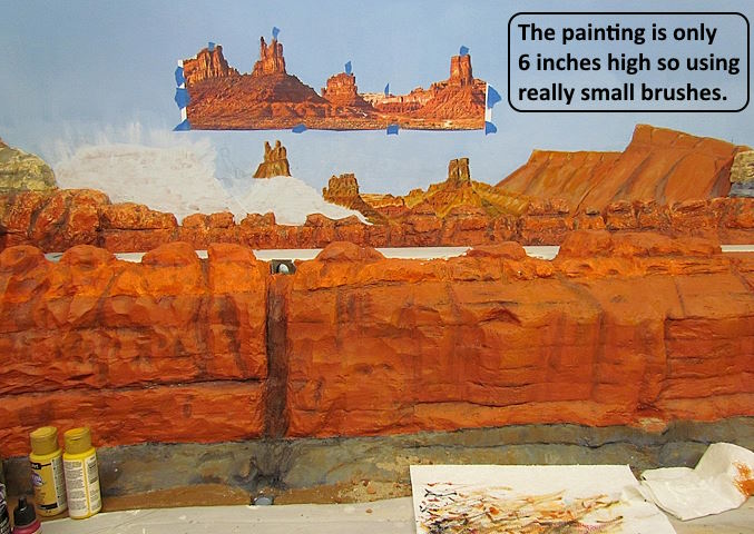 The two prints were taped together and cut along the skyline like what I did on the last backdrop. Above you can see there was going to be parts of the old back drop showing and I didn’t want that so painted anything behind the print that showed sky color. I might end up painting all of the old skyline blue and repainting it also.