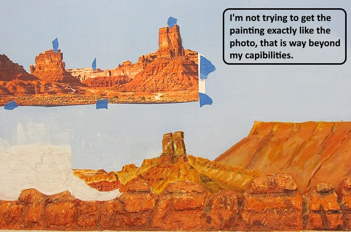 The print was taped in place and the outline was penciled in. A real artist would probably sketch it in and not track the skyline, but I’ll cheat a little. I then did sketch in the foreground outlines in the bet I could. Then started on the far background (right side) and moved to the foreground (not sure if this is recommended or not?).