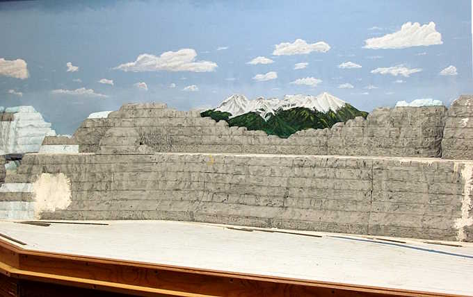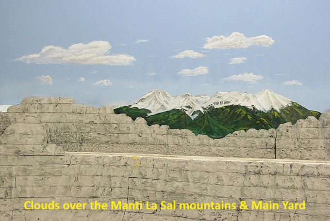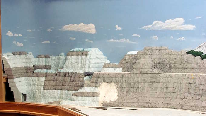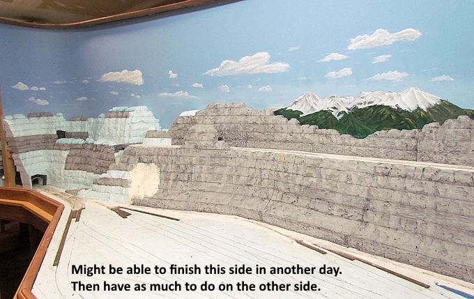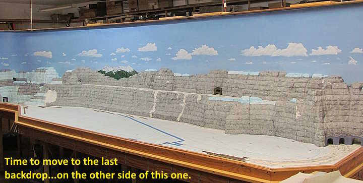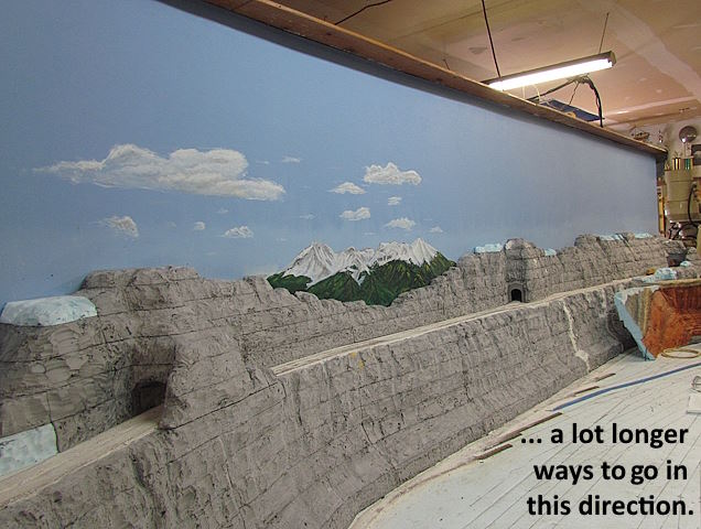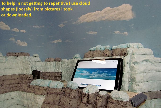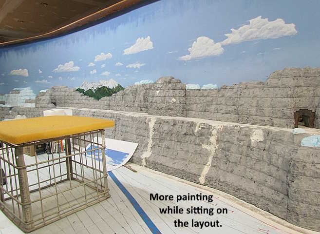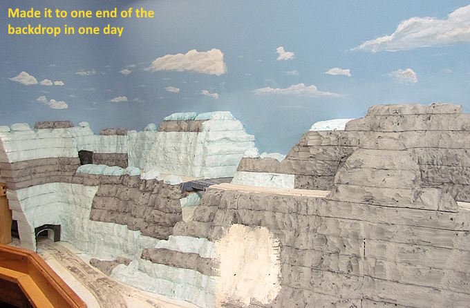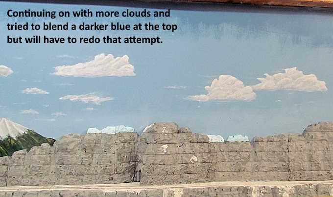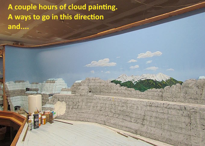 Getting started painting clouds on the long backdrop above the main yard and engine facility.