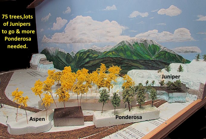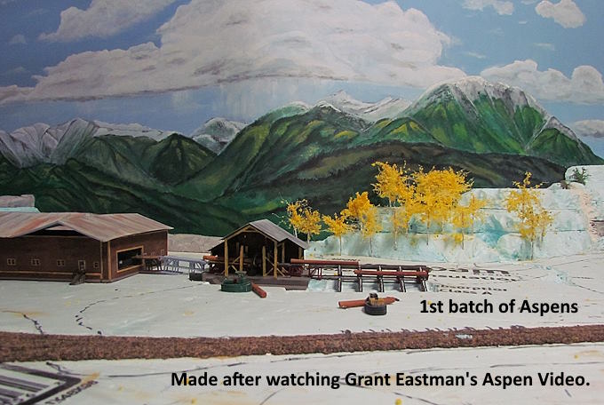 I made a couple Aspens following the instructions in Grant Eastman’s great video ( HERE ). Then Ed came aboard and made over 60 more. Probably enough for the sawmill scene which is set higher in elevation at the base of the mountains.