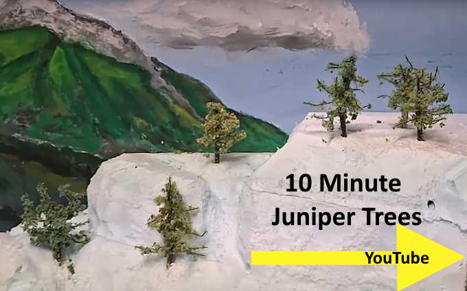 The rest of the layout is a couple thousand feet lower with Junipers and Pinion Pine needed there for the mesa tops. I tried a couple different techniques using different peoples ideas on how to make trees and came up with some I can make in about 10 minutes each. I’m still perfecting it a little but the video on what I’m doing is above and ( HERE ).