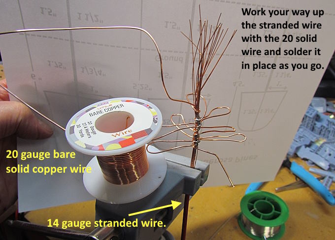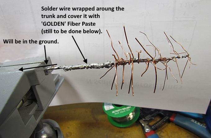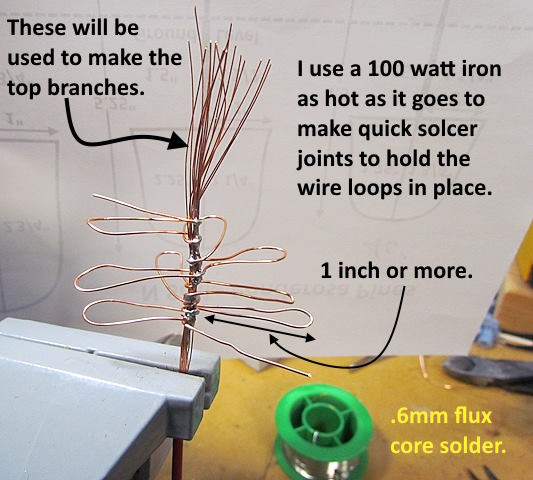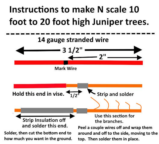 Above is a breakdown on how to strip, solder and work the 14 gauge stranded wire. Most of the Juniper’s in this area are 20 feet or less, so only about 1 ½” tall in N scale. They are scrubby and usually have broken and dead branches.