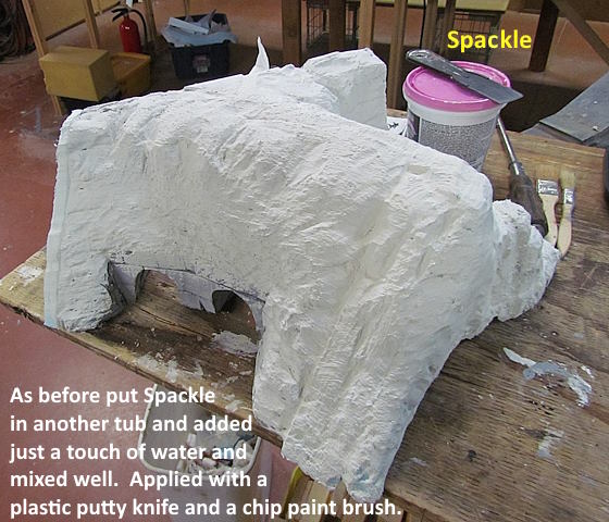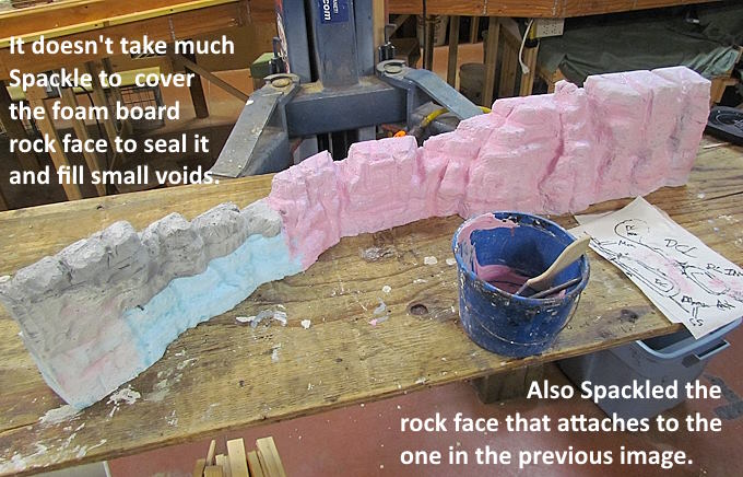 By carving the foam board into the final shape or close to it one doesn't need to use Sculptamold or build up thick layers of Spackle. This saves money and keeps the layout's weight down. The Spackling above and on other sections as been thinned just a touch with a light sprinkle of water. Then mixed so that it is creamy. Applied in clumps with a plastic putty knife.....pressed into seams and voids....and then brushed all over with a cheap chip brush. Then the brush is wetted a bit and run over the Spackle which makes it smooth but you can also add rock strata lines with the brush. Maybe 15 minutes to cover the above..