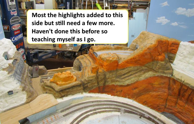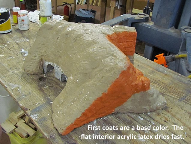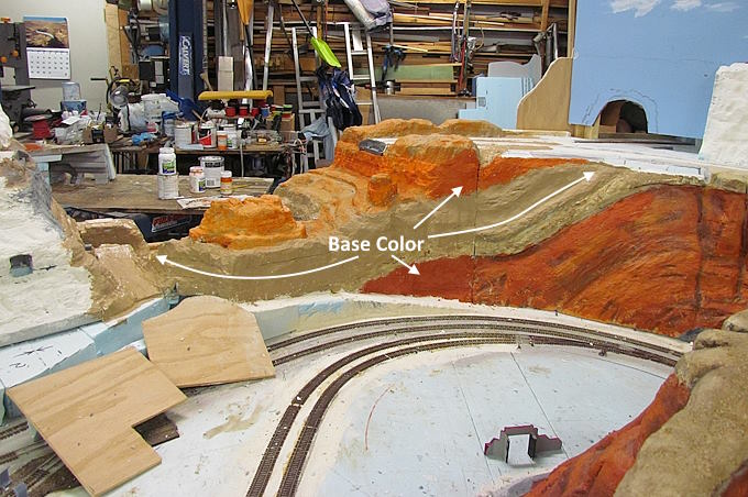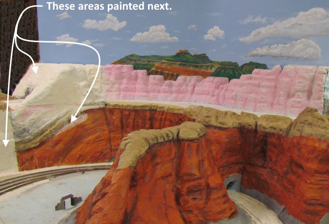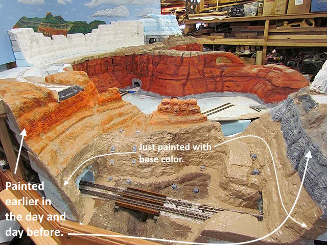 First painting step is to put on a base color for the section being worked on. Here the bottom rock strata to the right is a different color than the red sandstone above it. The sand color on the face to the left is red sandstone that had broken down into sandy dirt with vegetation on it . I'll be adding sand and vegetation (later) that would of ended up covering up the red sandstone to the point where one wouldn't see the red.