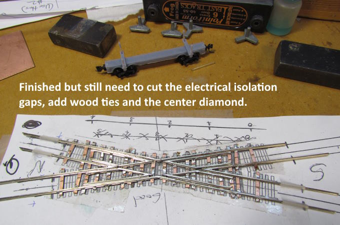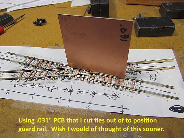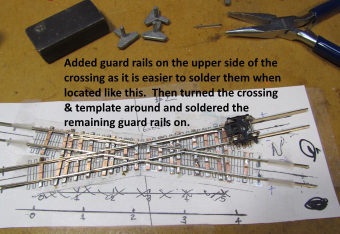 It was easier to solder the upper set of guard rails that were away from me and then turn the template/crossing 180 degrees and solder the other ones in.