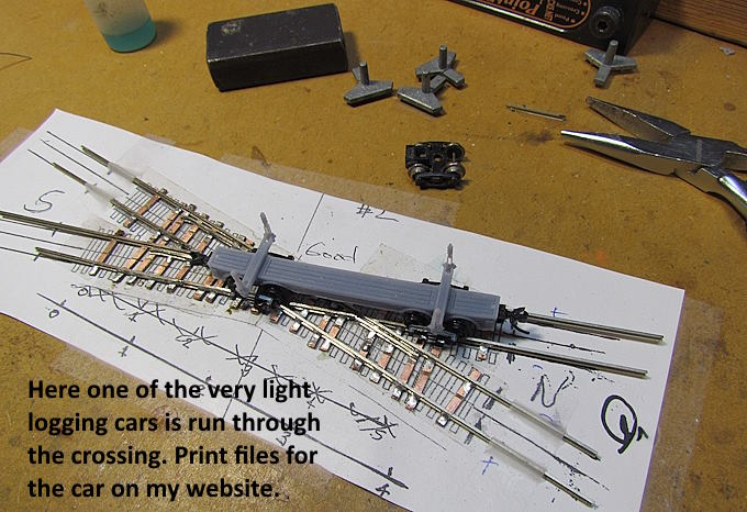 The log car above (print files here down the page aways) is very light and proved to be a good test car for the crossing.