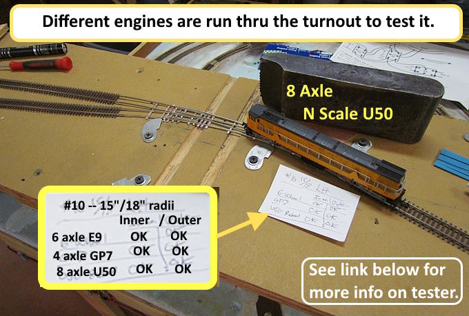 I usually test with all 3 of the locos shown above. Usually the 6 axle E9 is the one that tests the functionality of the turnout the most but the U50 with the inside sets of axles also finds turnouts that need more work.