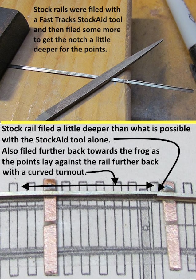 Above you can see the stock rails are filed a little deeper than what you might be able to do using the StockAid filing jig alone. You might also find you need to file further towards the frog for the outside stock rail of a curved turnout. The closure (points) rail lays on the stock rail for a greater distance than for a straight turnout.