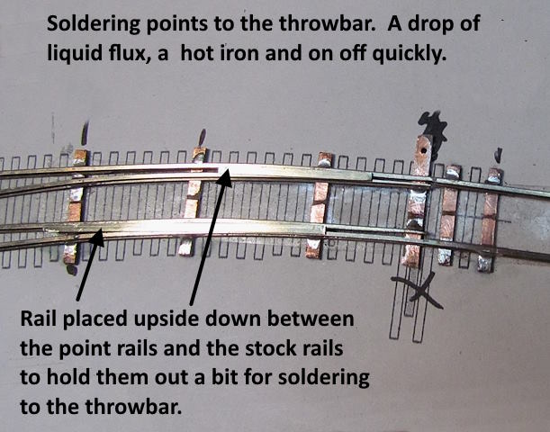 I use Superior #30 liquid flux in a bottle with the metal tip squeezed shut. Put a small drop where the point lays on the throwbar. Then have my 60 watt iron as hot as it goes.....touch the tip to the joint in the flux.... melt solder into the joint and get off as soon as I see it flow and attach to both. Usually only a second or so. You don't want solder to flow to the other side of the point making it hard for the throwbar to slide under the stock rail. If any ends up on that side file it off with a thin file.