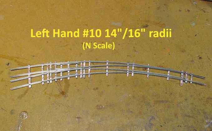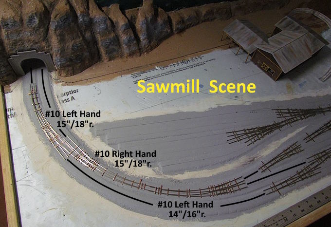 The #10 lefthand above with a 14" inner radius connects the inner main track to the tracks by the sawmill.