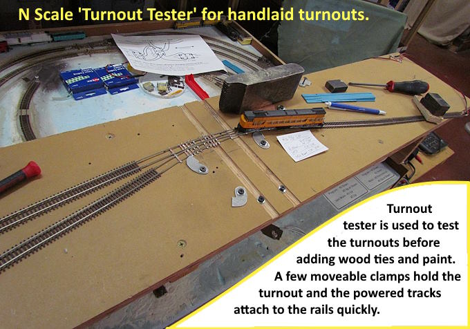 The metal clamps can be moved or rotated to hold the crossing or turnout in place while powered tracks are connected using joiners soldered only to the track pieces. You can have a turnout or crossing in/on the tester in a minute or so.