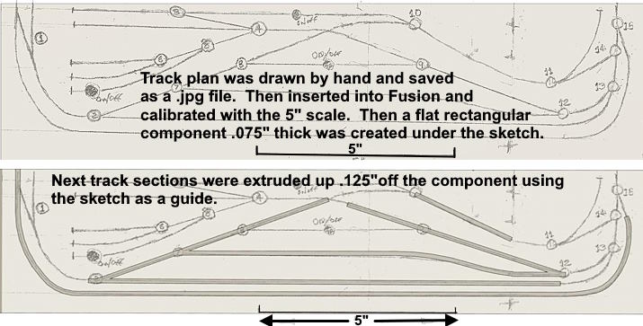 ..... by drawing a sketch of the track plan to close-to the size I wanted the final panel to be. I scanned what I had drawn with the printer and saved it as a .jpg file. I then opened the free version of Fusion I use and inserted that image onto one of the work planes (top part of image above). Next I calibrated it to true size using the 5 inch scale that had been made on the drawing.