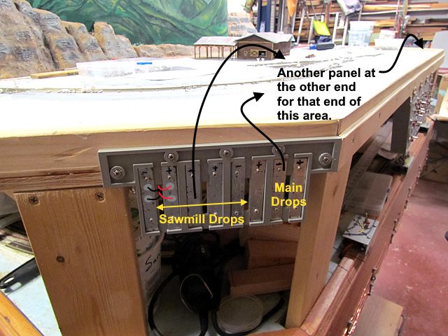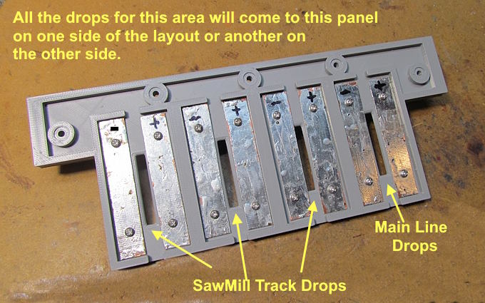 I'll be soldering all the track drops at the side of the layout. One, for convenience (not having to solder looking up) and because I can't get under it with the staging area there. There will be two solder pad panels that the track drops can be soldered. One on each side of the fascia by the sawmill complex. One set of solder pads (right side) will be for the drops off the main line which I will be able to switch between DCC and DC at any time with my throttle. The three sets of solder pads to the left will be for the sawmill track/turnout drops.