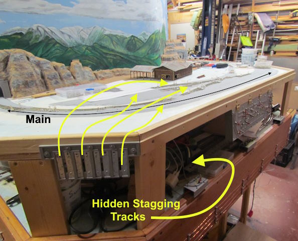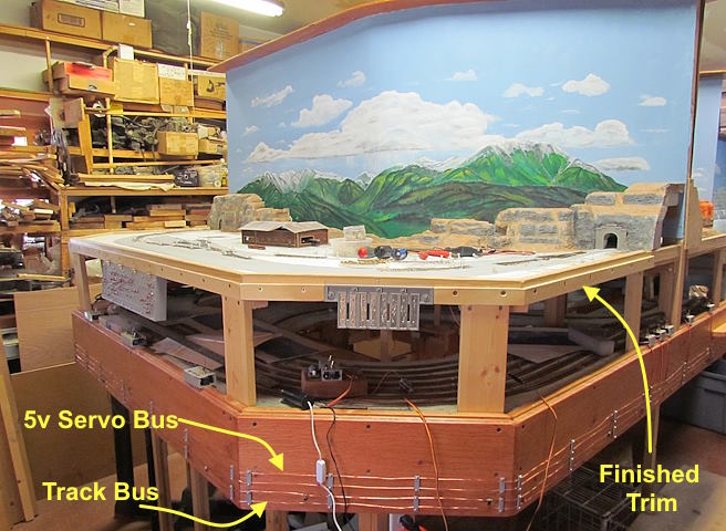 On the lower level I have a track bus and a 5v bus that are out on the fascia. I love the fact that I don't hardly ever have to go under the layout to wire the track drops to the bus. I solder the drops to the rails. Drop them under the layout.....reach under... pull them to the side.... and solder them to the buss ( HERE ). Works great especially at my age.