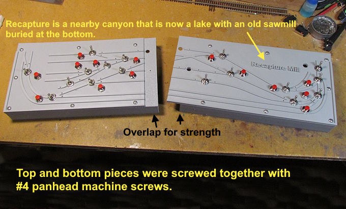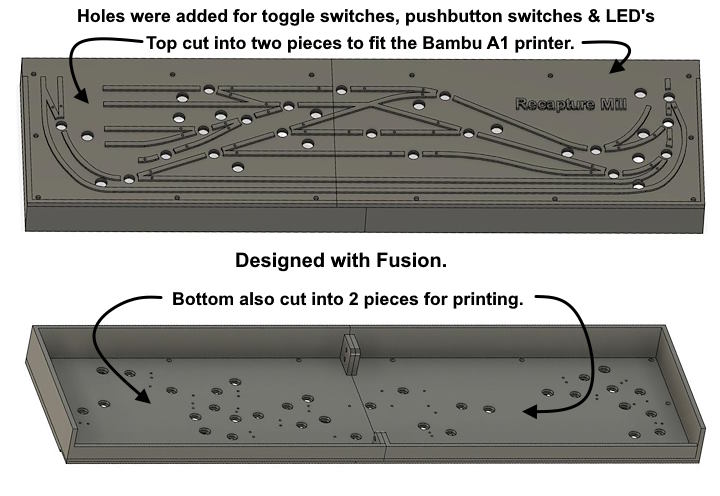 For printing purposes the control panel was created as 4 pieces. The top is two pieces and the holes were added for the toggle and button switches and for the LED's. It is designed to print flat on a filament print with the track plan up. The bottom was also designed as two pieces and has a top, sides and mounting tabs and is printed upside down like shown above on the build plate of the printer. This was a simple project to do in Fusion.