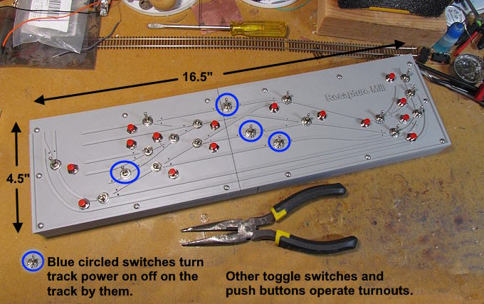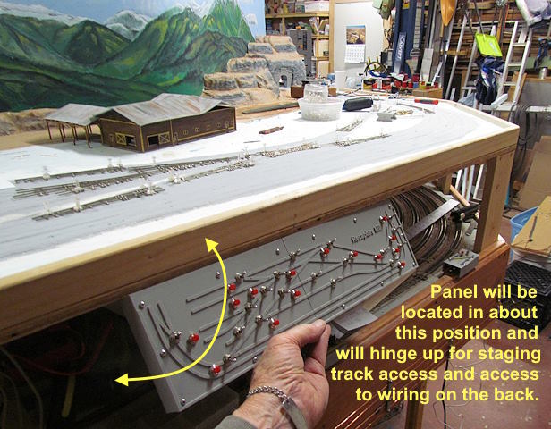 Up to this point the switch boxes to control the servo at the turnout have been located by the turnout they control. That was an option here but decided to try making a control panel and move the toggle switch, button switch and LED's to the control panel. We will see if this is a good move or not.
