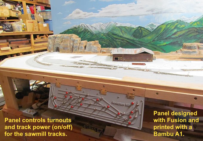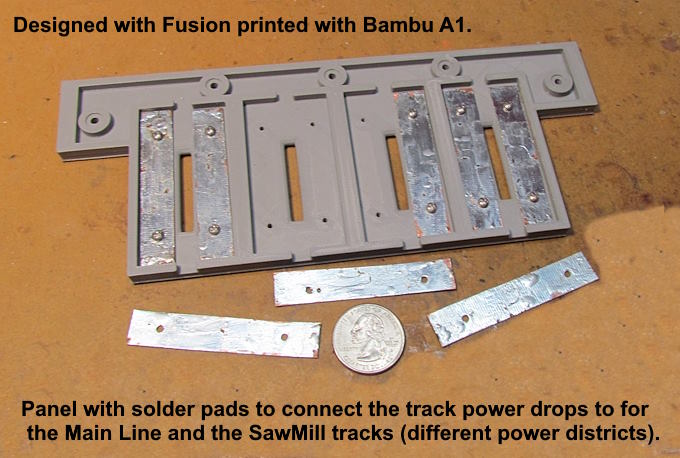The solder pads were cut from a small sheet of PCB that was very inexpensive on eBay. The panel was designed with Fusion in and hour or so and printed with the Bambu A1 in less than 2 hours. This is one of two that will be used. One on each side of the sawmill scene to keep the track drops short. The layout is 6 feet wide here.