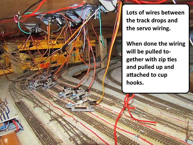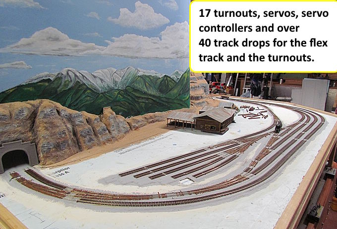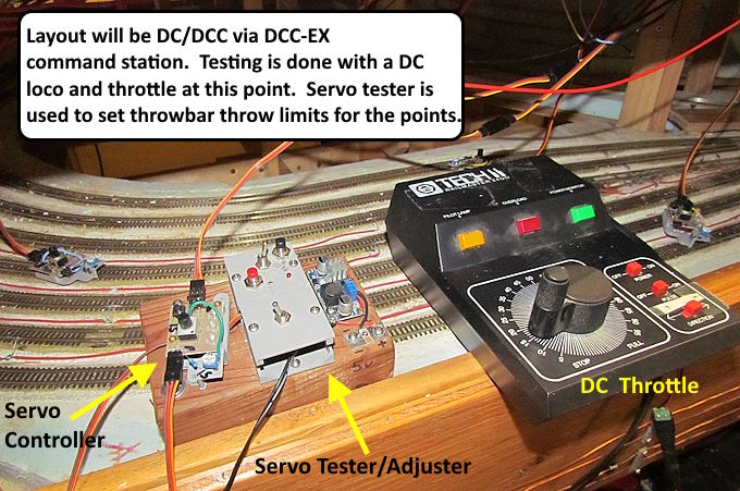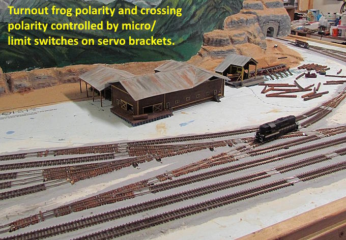 Getting close to being able to run a loco and a couple cars around the sawmill complex. I can do that now except I can only throw one turnout at a time with the servo tester/adjuster connected only to that turnout.