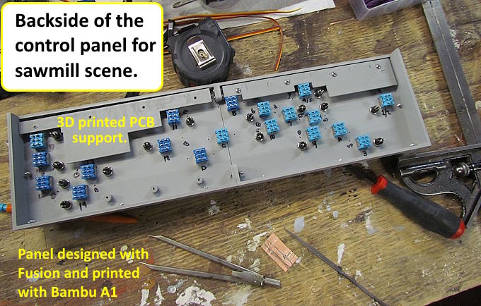The round objects next to the toggle switches are on/off push button switches. You throw the toggle and the appropriate LED lights. Then you push the button switch and the turnout throws. I do this so that the servos are only powered while throwing. Cuts down of power needed and also I don't like the servos powered all of the time. The layout will end up with over 70 servo controlled turnouts so that would be a lot of servos powered at the same time.