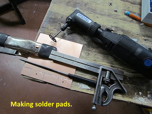 ..... a number of solder pads for wire connections. I like making these as the PCB material is cheap on eBay and I can get a lot of connections into a small area and it is easy and quick to solder wires the pads. I've found that it is really easy/quick to cut the isolation gaps with the right angle Dremel tool above with a diamond grit cutting disc. I then clean the cut up with the triangular file.