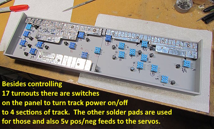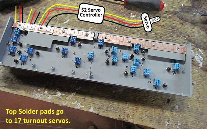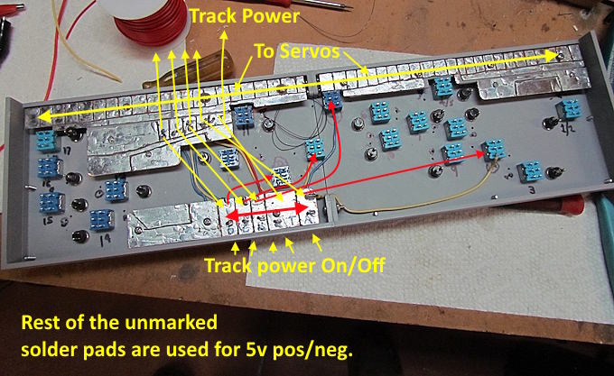 Servos and the servo controller I use have three wires from the panel to the $2 controller and on to the servo. The panel will control 17 servos but there are two locations where the toggle switch on the panel will throw 2 servos/turnouts. Across the top are 15 sets of three pads that the wires to the servo controllers will solder to.