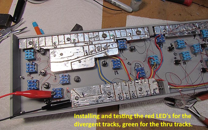 Above the yellow, blue and red wires are for the four on/off track power sections. With that wired I started wiring in all of the red LED's that will indicate if the route chosen is the divergent route of the turnout being controlled. I'm testing them as I wire them with alligator clips to the toggle switch and to one of the ground pads. Some of the other solder pads are 5v negative & positive pads used for the servo and LED wiring.