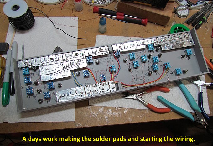 I got a day (not 8 hours) into making the solder pads and wiring to this point. Probably two more partial days to finish.